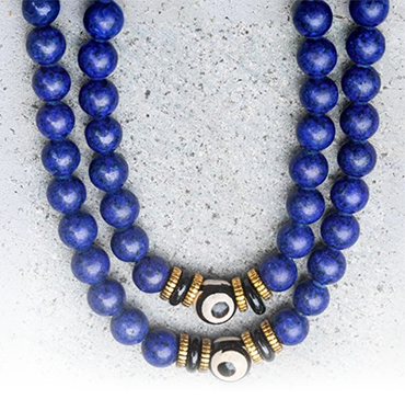 I love this mala. Everything from the beautiful Lapis, the weight, and the craftsmanship. The heavy duty cord that runs through the beads feels as though it may outlast me. The beauty of this mala make it hard to put away. If I were to complain about anything it would be that some of the nazars painted on the marker beads are not well centered. But as this is hand crafted that is to be expected. Beautiful piece. Love it!